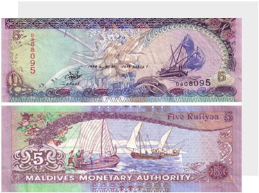 Официалната валута е Малдивска Руфиа, независимо, че Малдивите имат собствена валута, общоприетото разплащателно средство е щатски долар, в последно време все по-популярно става и еврото, макар то да е с неизгоден курс. Хотелите на островите предпочитат разплащане в чужда валута. Приемат се повечето кредитни карти. Можете предварително да проверите къде е най-близкия банкомат!